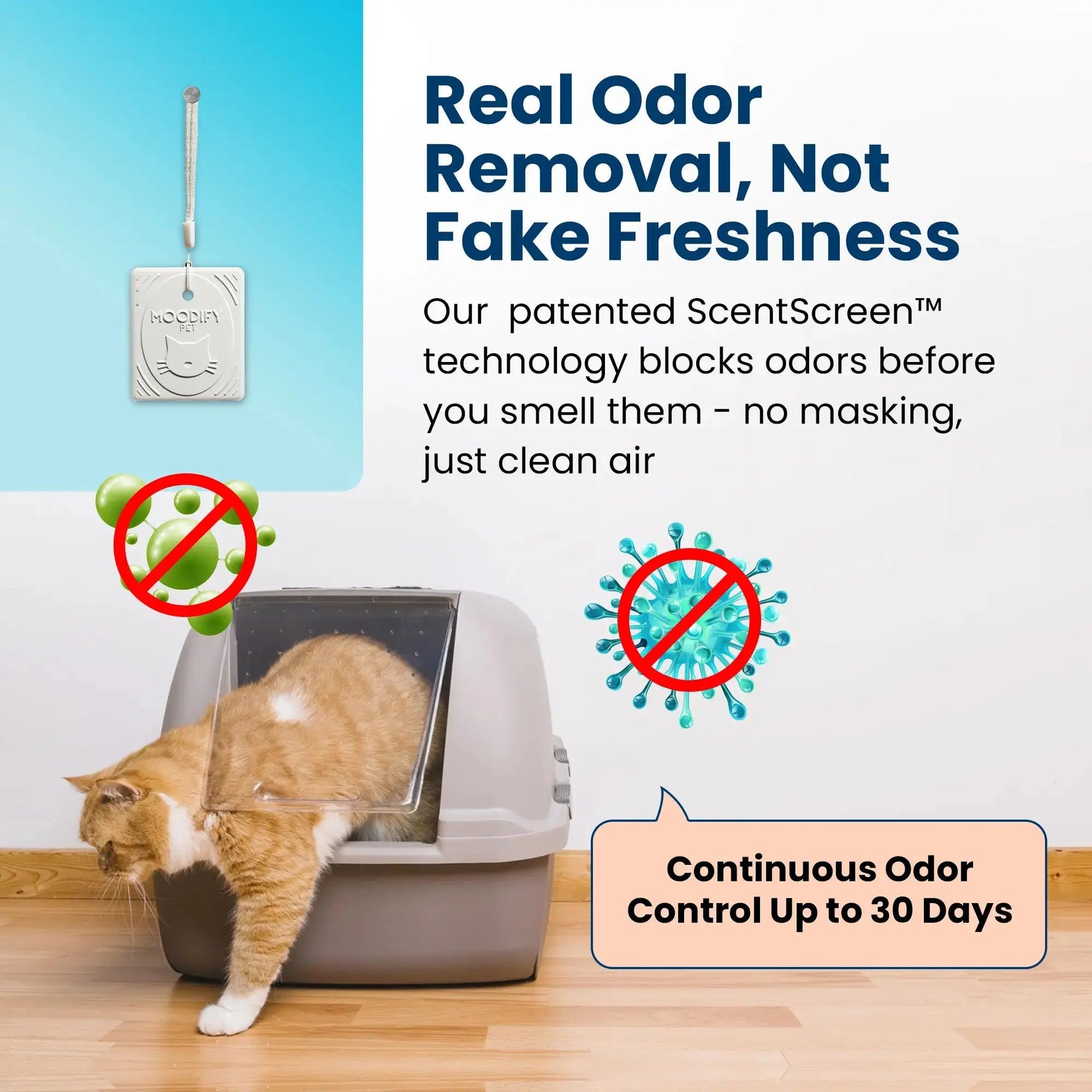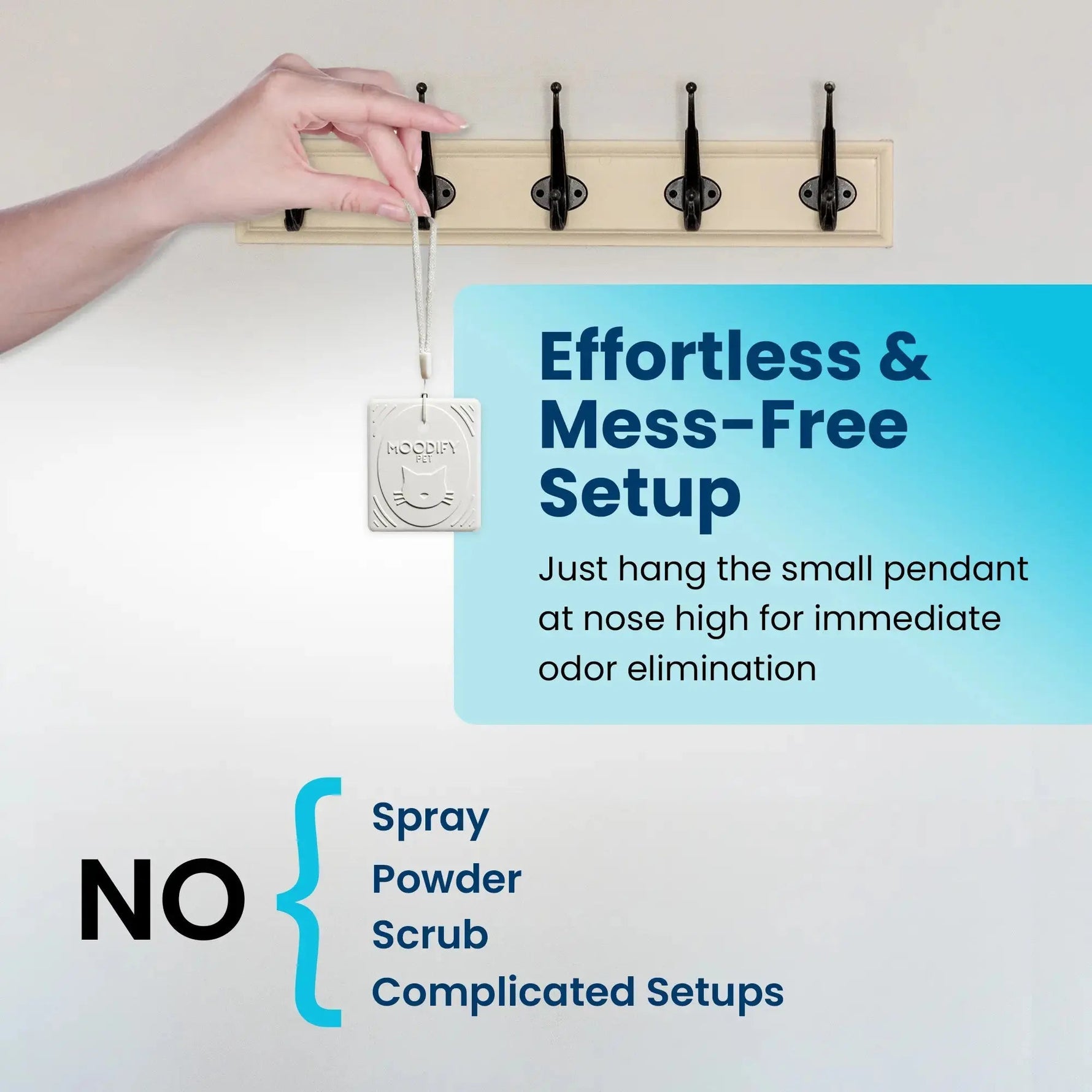 MoodifyPet is a patented, non-toxic solution designed to remove cat box smell for up to 4 cats. This powerful, scent-free pendant uses science—not perfume—to target and neutralize odor molecules at the source.